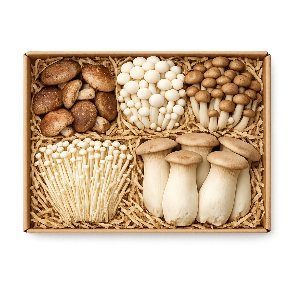Nasz Box Grzybowy to starannie wybrana kompozycja najszlachetniejszych gatunków. Znajdziesz tu grzyby Shiitake, Shimeji, Enoki oraz Boczniaka Mikołajkowego. Każdy z nich oferuje inny aromat oraz zróżnicowaną teksturę.