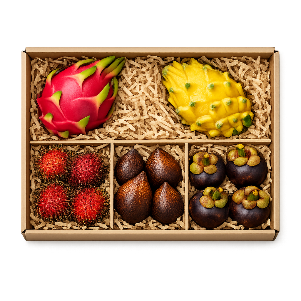 Nasz Box Indonezyjski to unikalne połączenie owoców o niespotykanych kształtach i zapachach. Znajdziesz tu soczystą pitaję, egzotyczny rambutan oraz słynny mangostan. Zestaw uzupełnia salak, znany jako owoc wężowy ze względu na swoją unikalną skórkę.