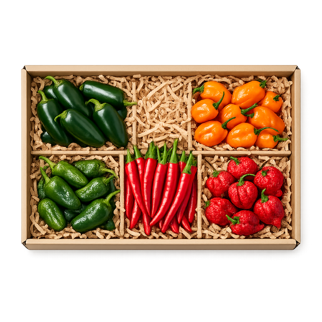 Nasz Box Paprykowy to starannie wybrany zestaw pięciu odmian świeżych papryk. Każda z nich oferuje inny stopień ostrości oraz unikalny aromat. Znajdziesz tu zarówno łagodne Padrone, jak i ekstremalnie ostrą Carolina Reaper. To doskonały wybór dla koneserów pikantnych smaków.