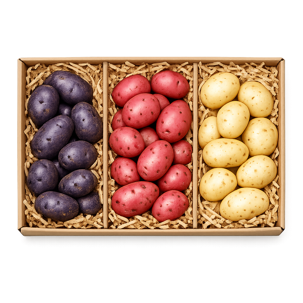 Nasz Box Trio Smaków to starannie wybrana kompozycja trzech odmian ziemniaków. Każda z nich wyróżnia się inną strukturą, barwą oraz walorami smakowymi. Znajdziesz tu ziemniaki truflowe, czerwone oraz klasyczną odmianę Agatha. To idealny wybór dla osób szukających kulinarnych inspiracji.