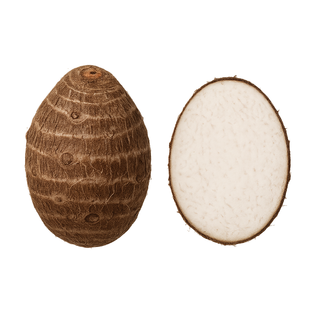 WAŻNE: Nie jeść na surowo! Obierz ze skórki (najlepiej w rękawiczkach, bo surowy sok może lekko szczypać w dłonie), pokrój i ugotuj, upiecz lub usmaż. Eddo po ugotowaniu staje się cudownie kremowe i lekko orzechowe – idealne do gulaszy, curry, azjatyckich zup lub jako oryginalne purée z masłem i czosnkiem. Przechowywanie: Trzymaj w ciemnym, suchym i przewiewnym miejscu (podobnie jak ziemniaki). Nie wkładaj do lodówki, bo niska temperatura psuje jego strukturę.