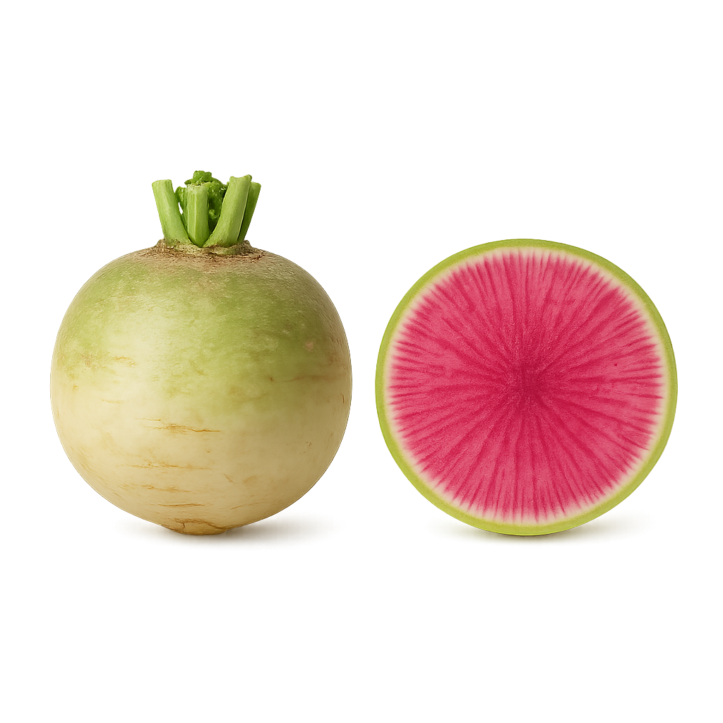 Biało-zielona z zewnątrz, ale po przekrojeniu oszałamia intensywnym, fuksjowym wnętrzem; smakuje jak łagodna rzodkiewka z nutą słodyczy.